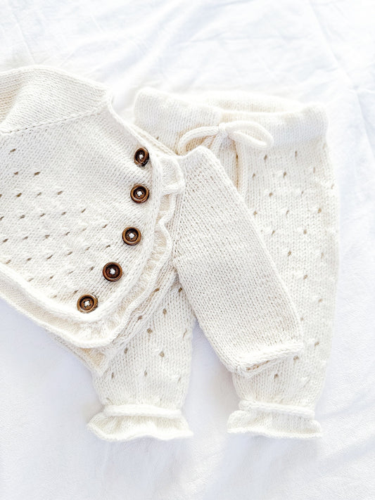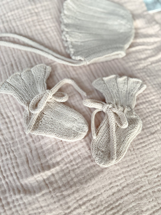 laget for akkurat det øyeblikket, mykt, tidløst og komfortabelt, slik at den lille kan møte verden på den aller fineste måten. Settet er strikket ovenfra og ned.