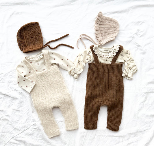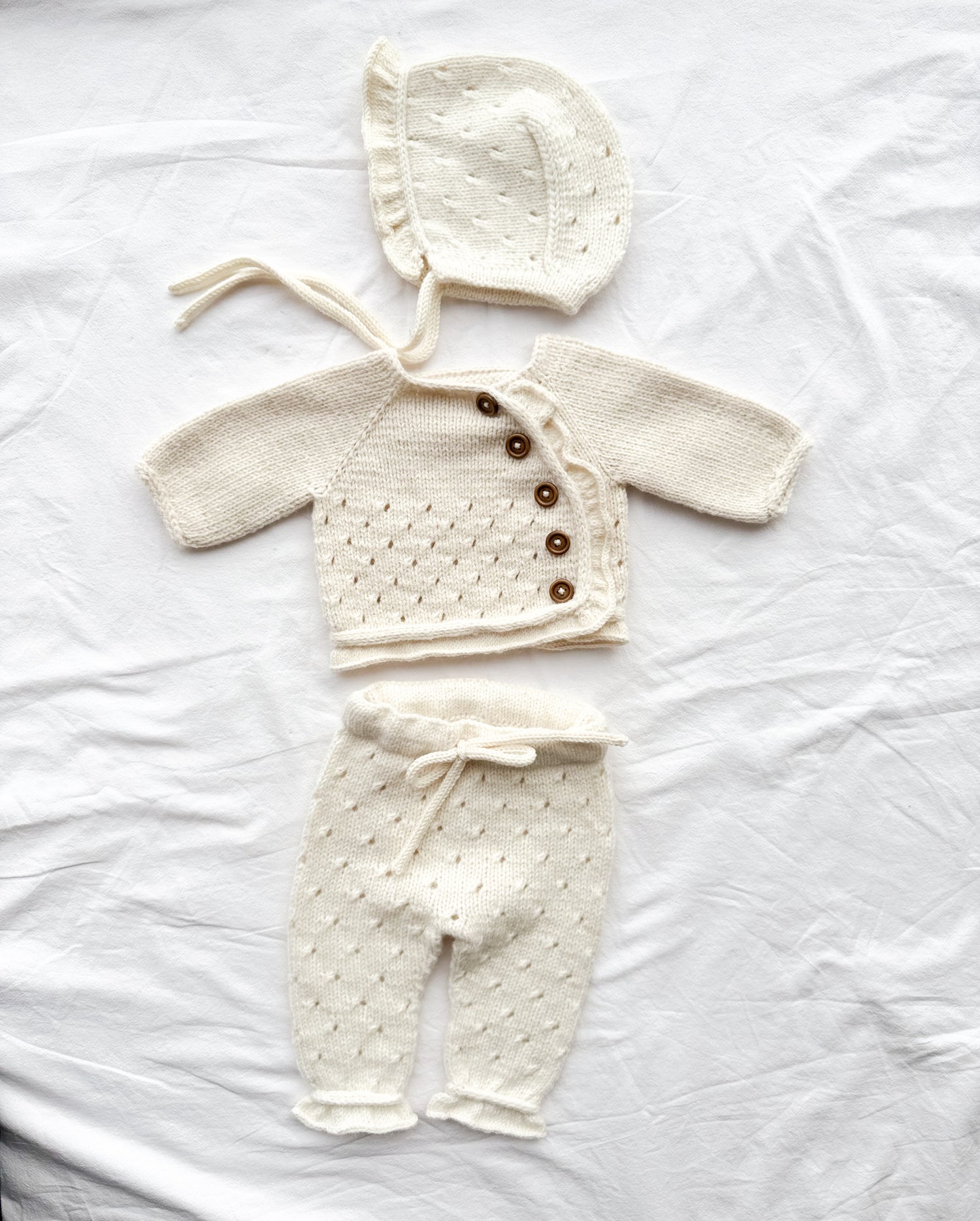 laget for akkurat det øyeblikket, mykt, tidløst og komfortabelt, slik at den lille kan møte verden på den aller fineste måten. Settet er strikket ovenfra og ned.