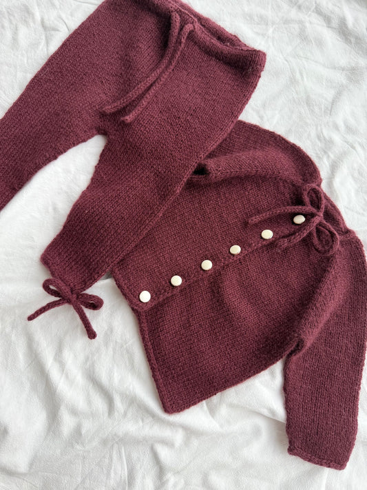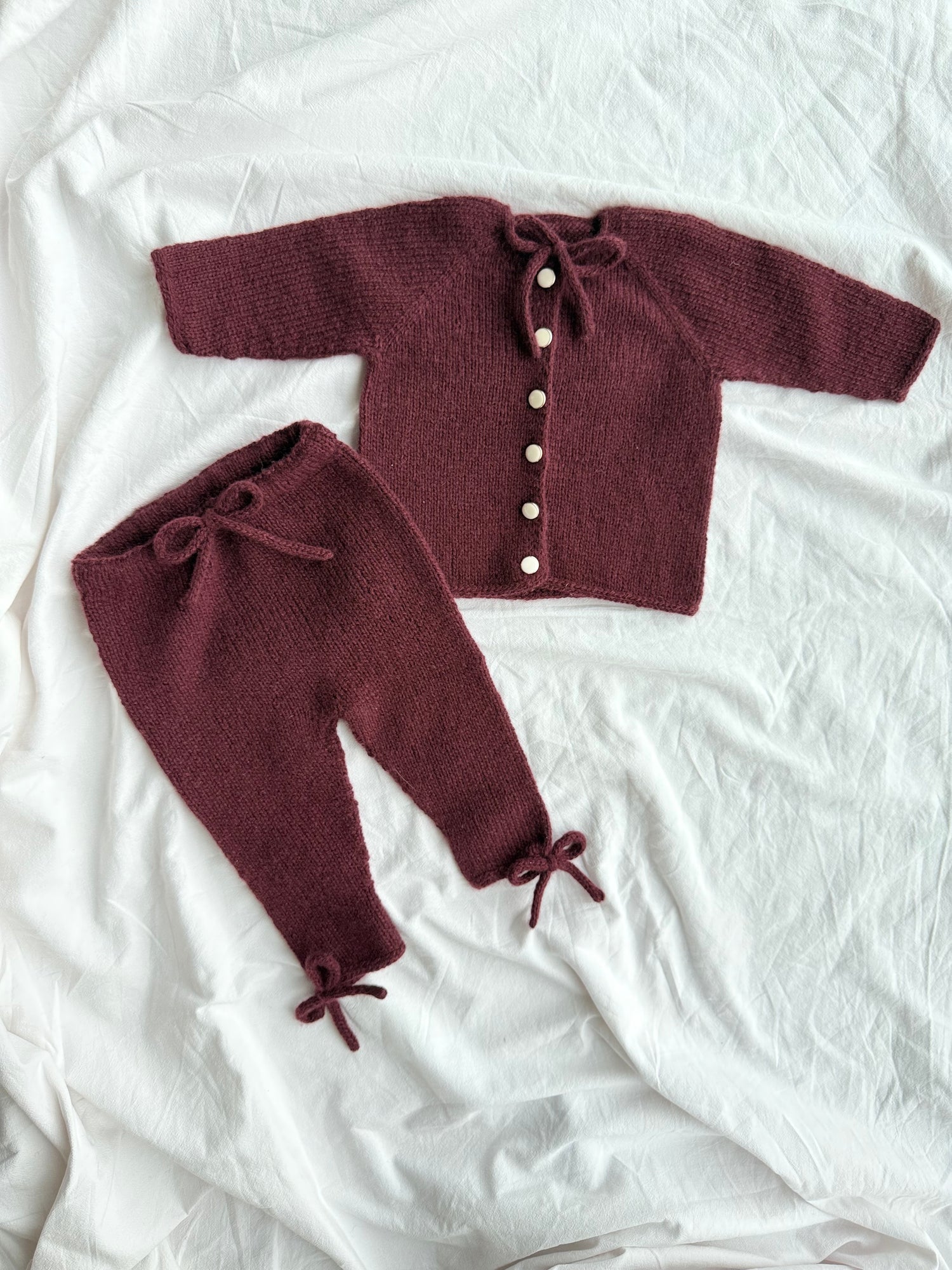 tidløst uttrykk, med gjennomført finish og uten unødvendige detaljer. Settet strikkes ovenfra og ned, noe som gjør det enkelt å tilpasse lengde både på bol og ermer underveis. Kantene avsluttes med i-cord, som gir en elegant, avrundet og profesjonell avslutning, helt uten behov for ettermonterte knappestolper, oppklipp eller vrangborder. Resultatet er et minimalistisk uttrykk der formen og garnet får spille hovedrollen.