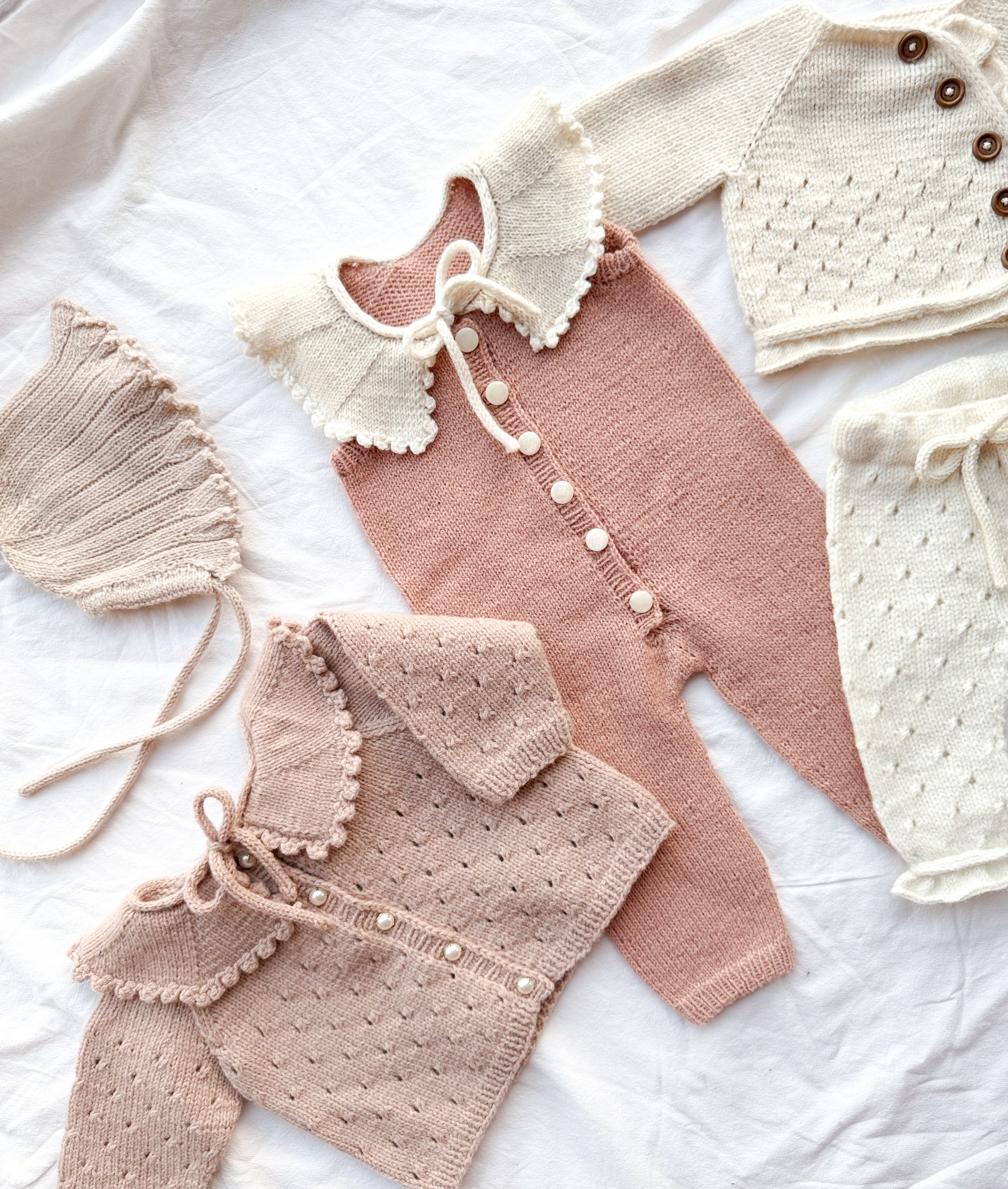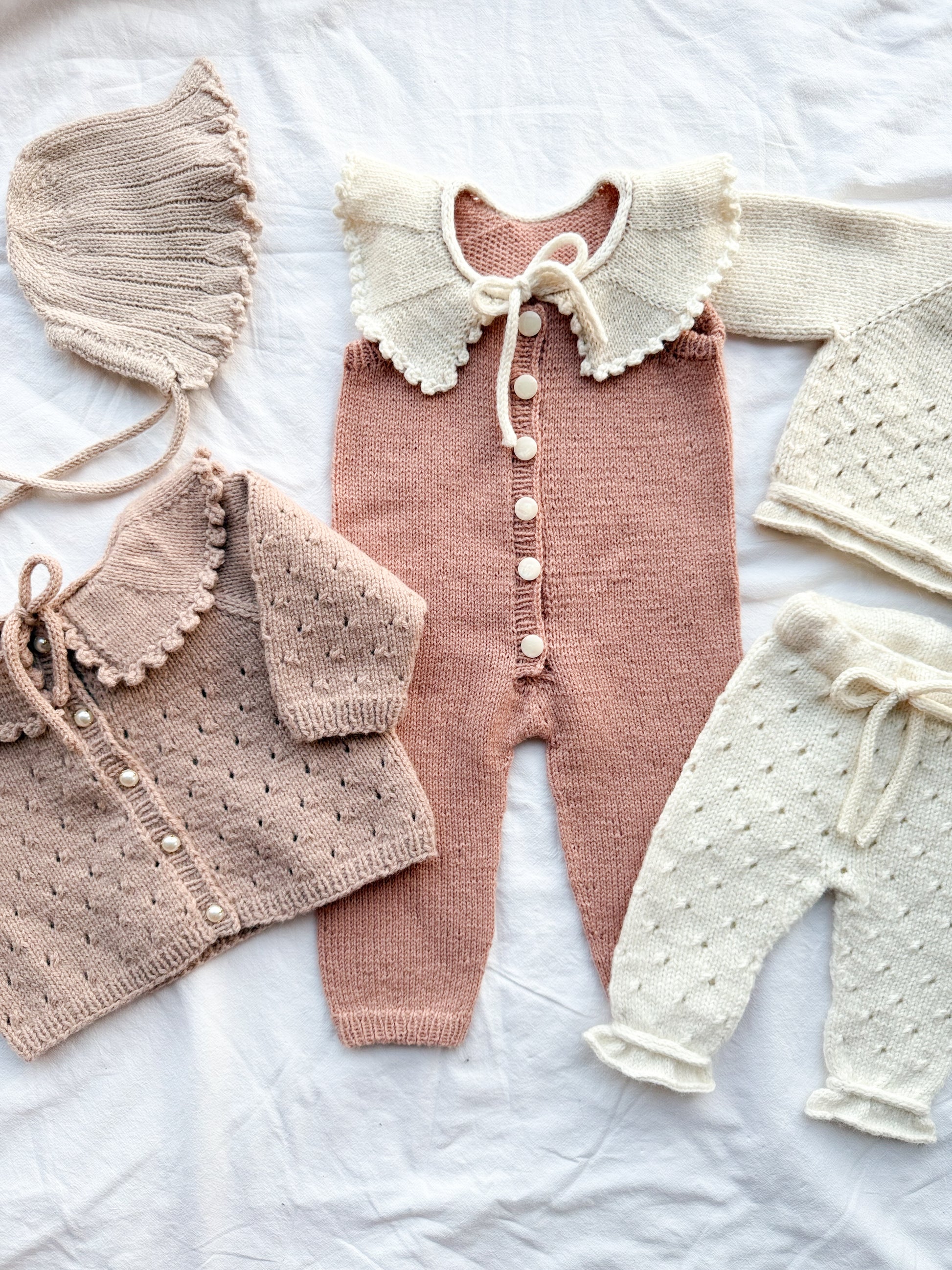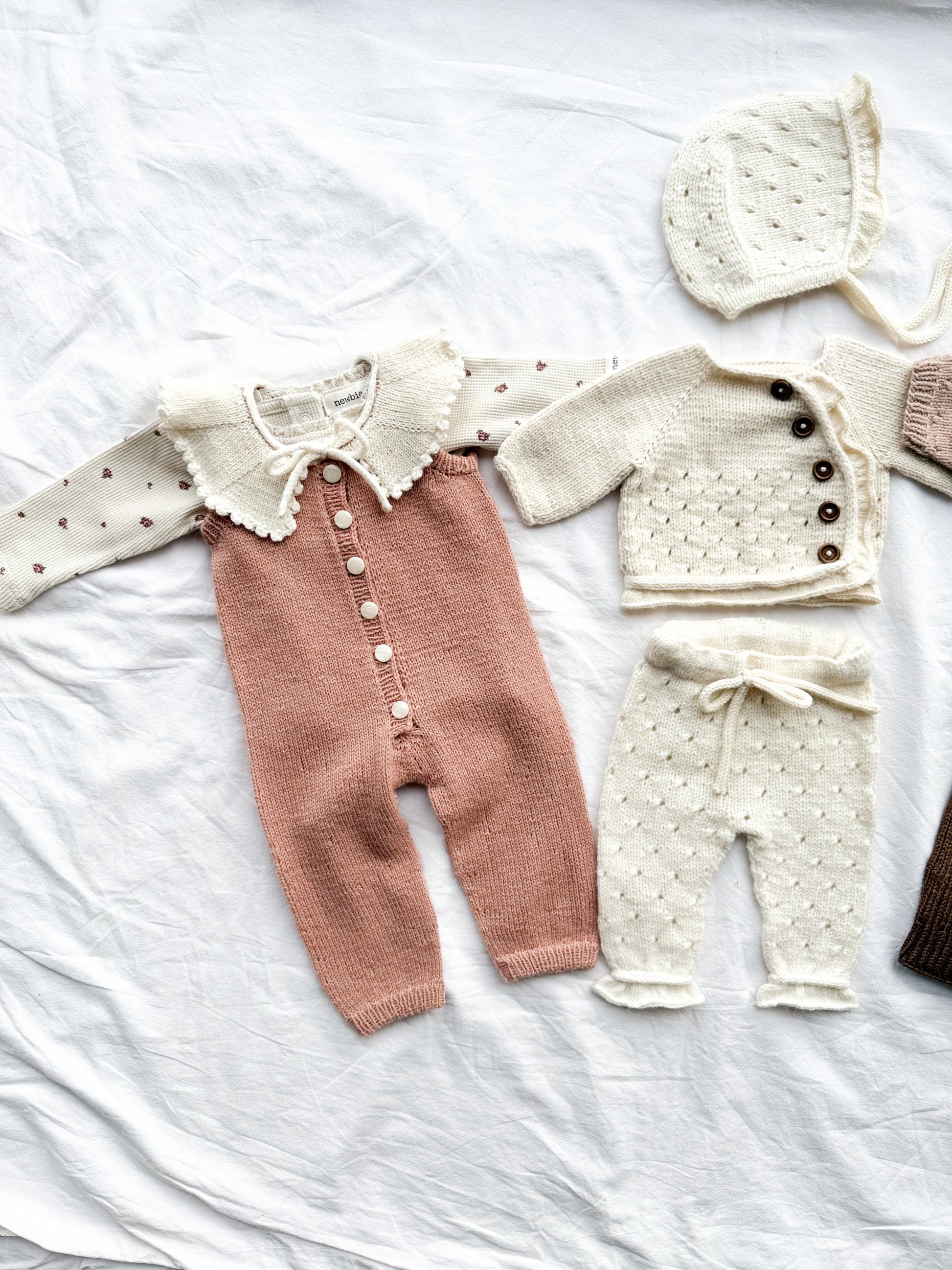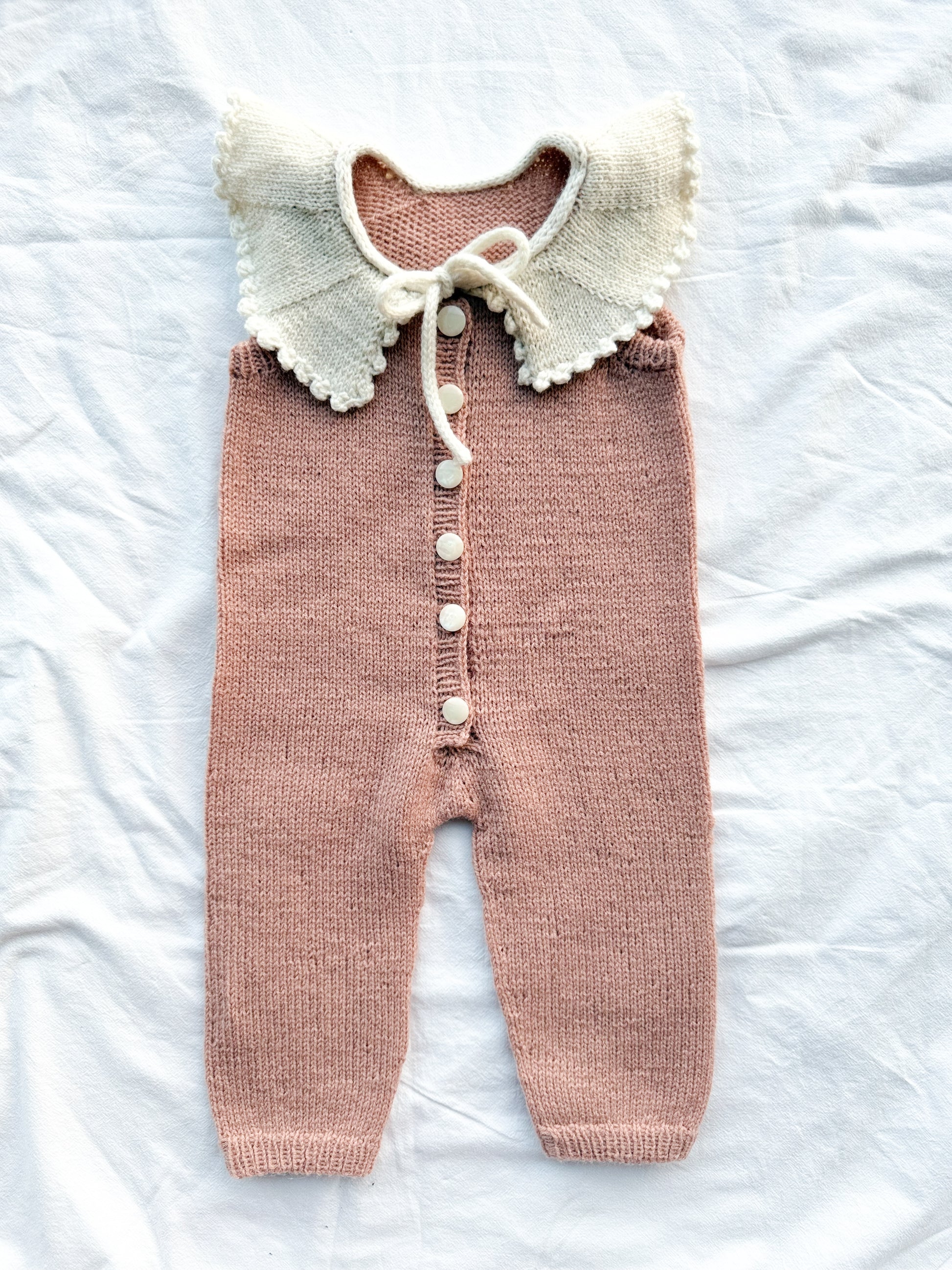 En enkel og tidløs sparkebukse strikket nedenfra og opp i glattstrikk. Bena strikkes hver for seg og settes sammen før kroppen strikkes videre. Knappestolpe i front gjør det enkelt å kle på barnet, og gir buksen et klassisk uttrykk. Den søte kragen strikkes til slutt og avsluttes med picot-kant og knyting foran.