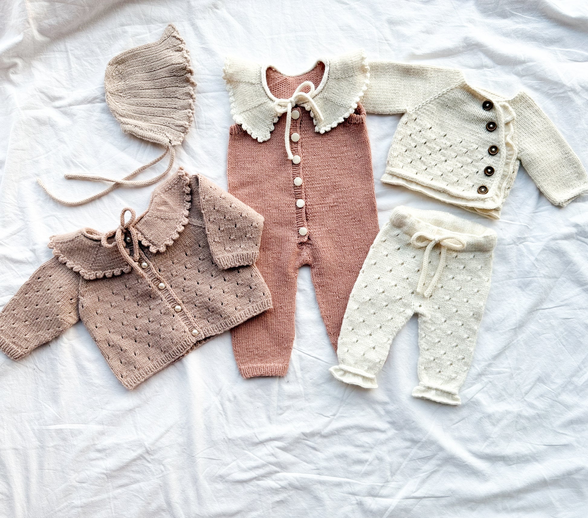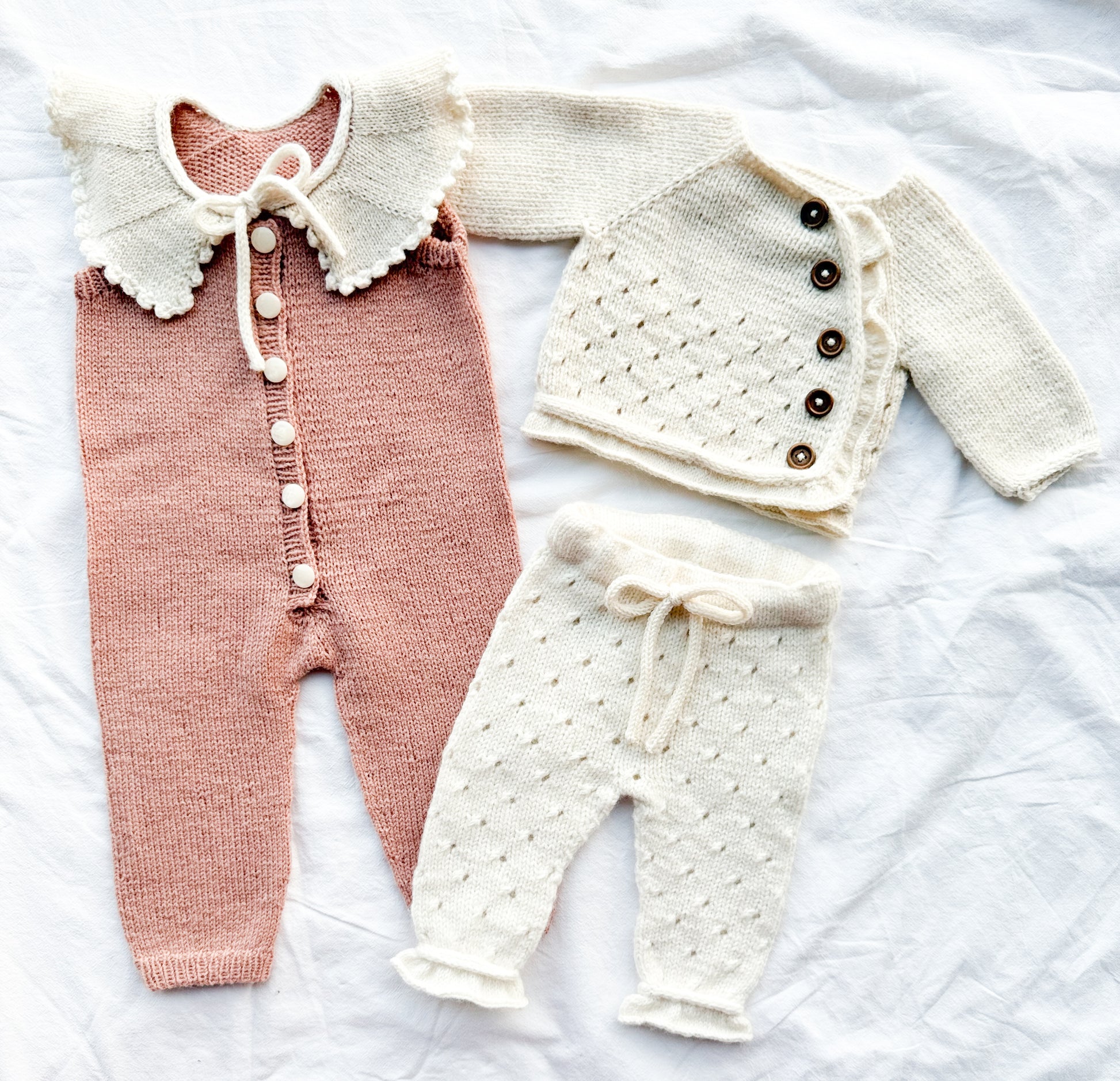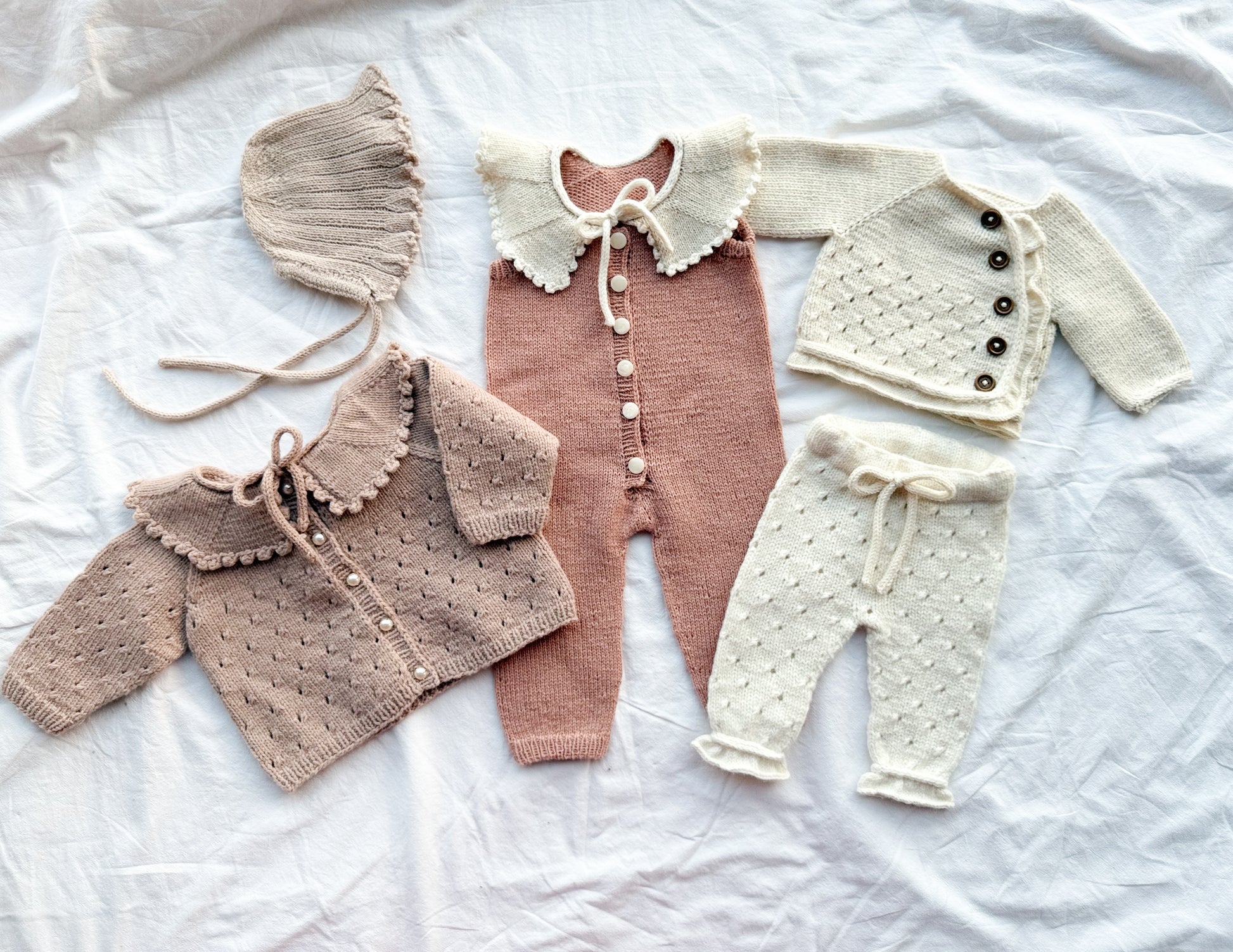 En enkel og tidløs sparkebukse strikket nedenfra og opp i glattstrikk. Bena strikkes hver for seg og settes sammen før kroppen strikkes videre. Knappestolpe i front gjør det enkelt å kle på barnet, og gir buksen et klassisk uttrykk. Den søte kragen strikkes til slutt og avsluttes med picot-kant og knyting foran.