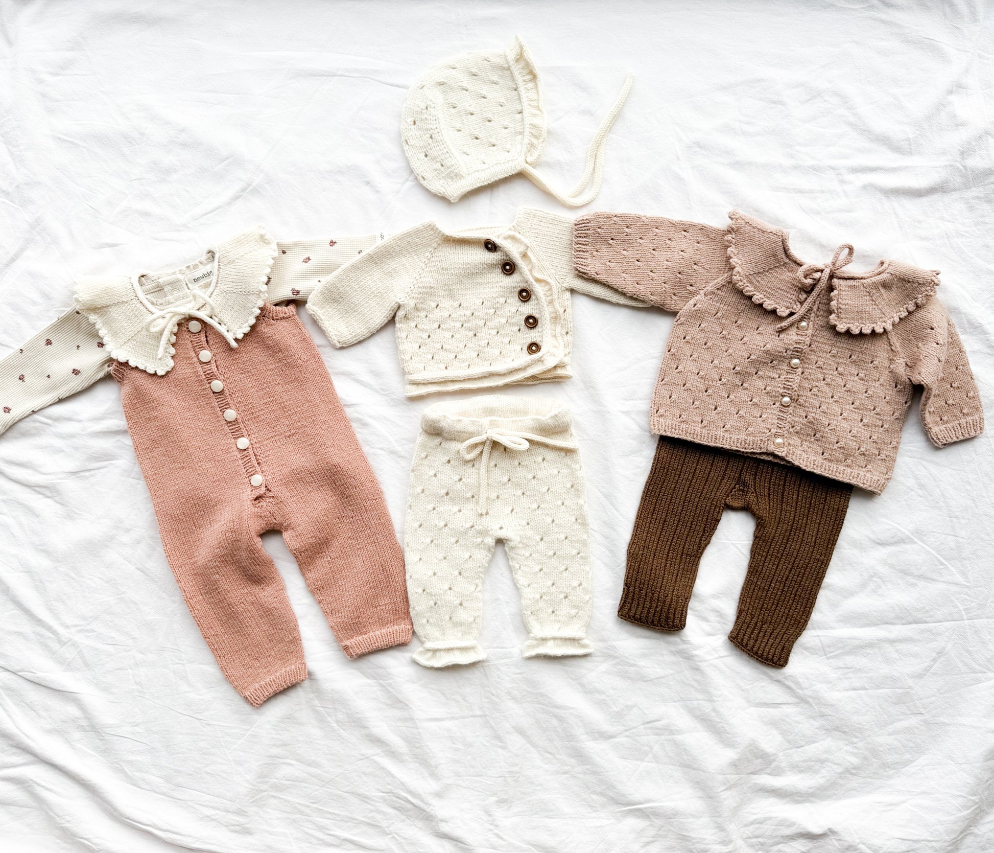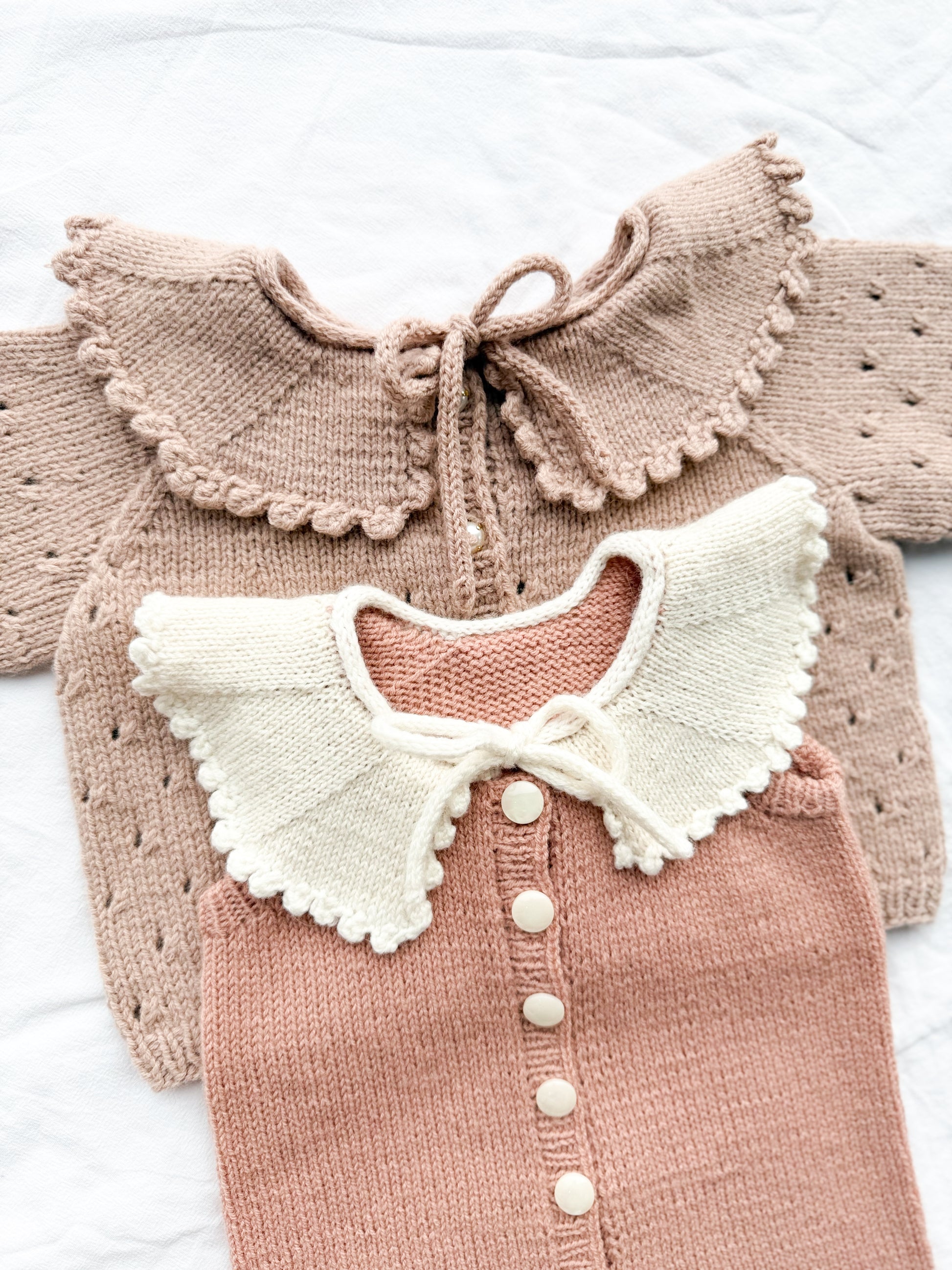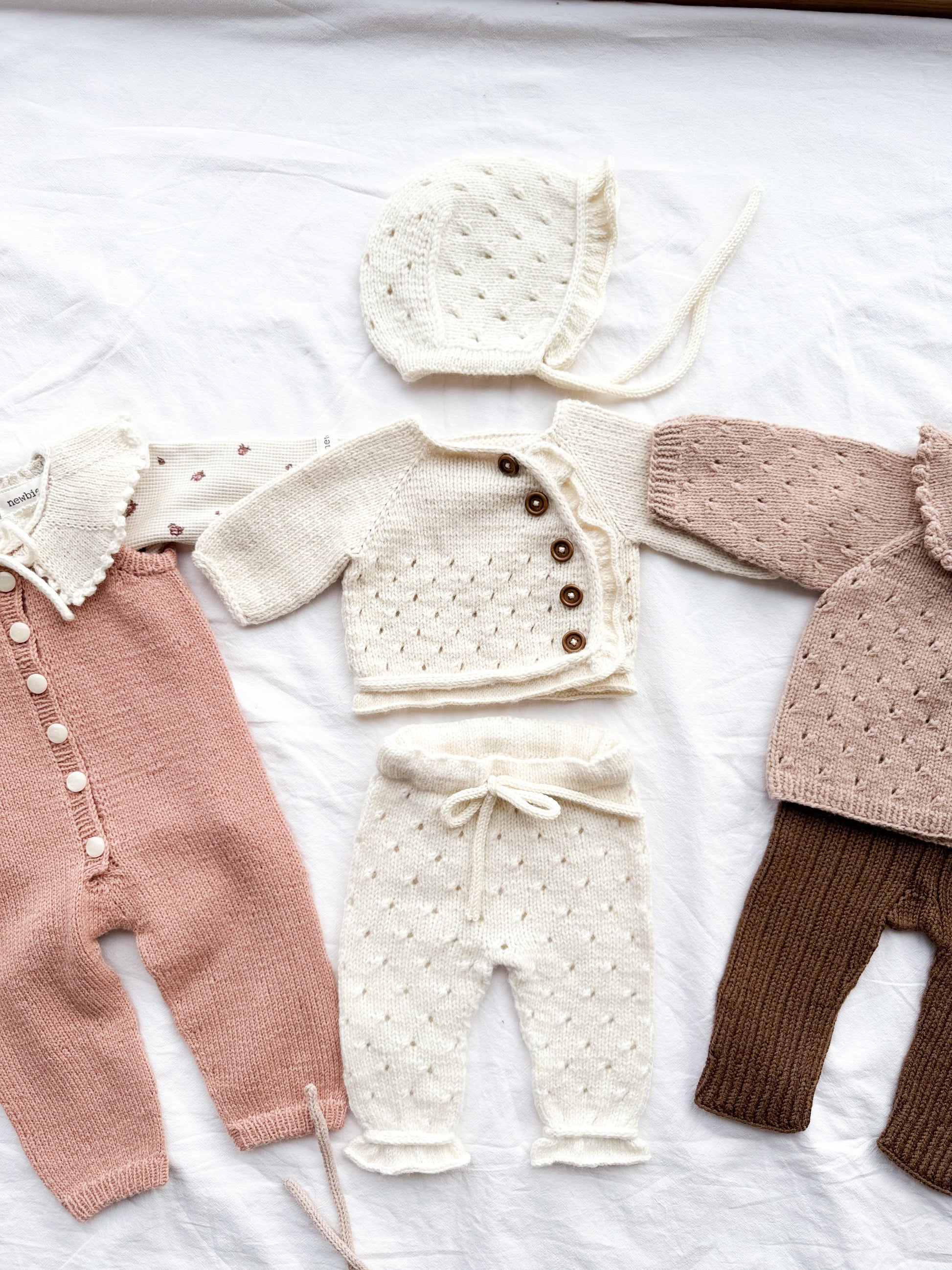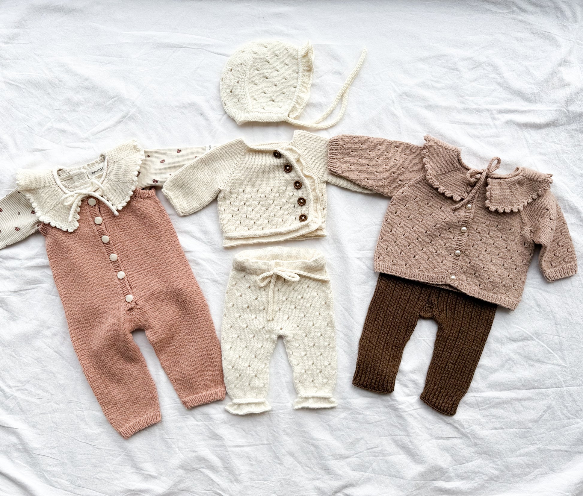 En enkel og tidløs sparkebukse strikket nedenfra og opp i glattstrikk. Bena strikkes hver for seg og settes sammen før kroppen strikkes videre. Knappestolpe i front gjør det enkelt å kle på barnet, og gir buksen et klassisk uttrykk. Den søte kragen strikkes til slutt og avsluttes med picot-kant og knyting foran.