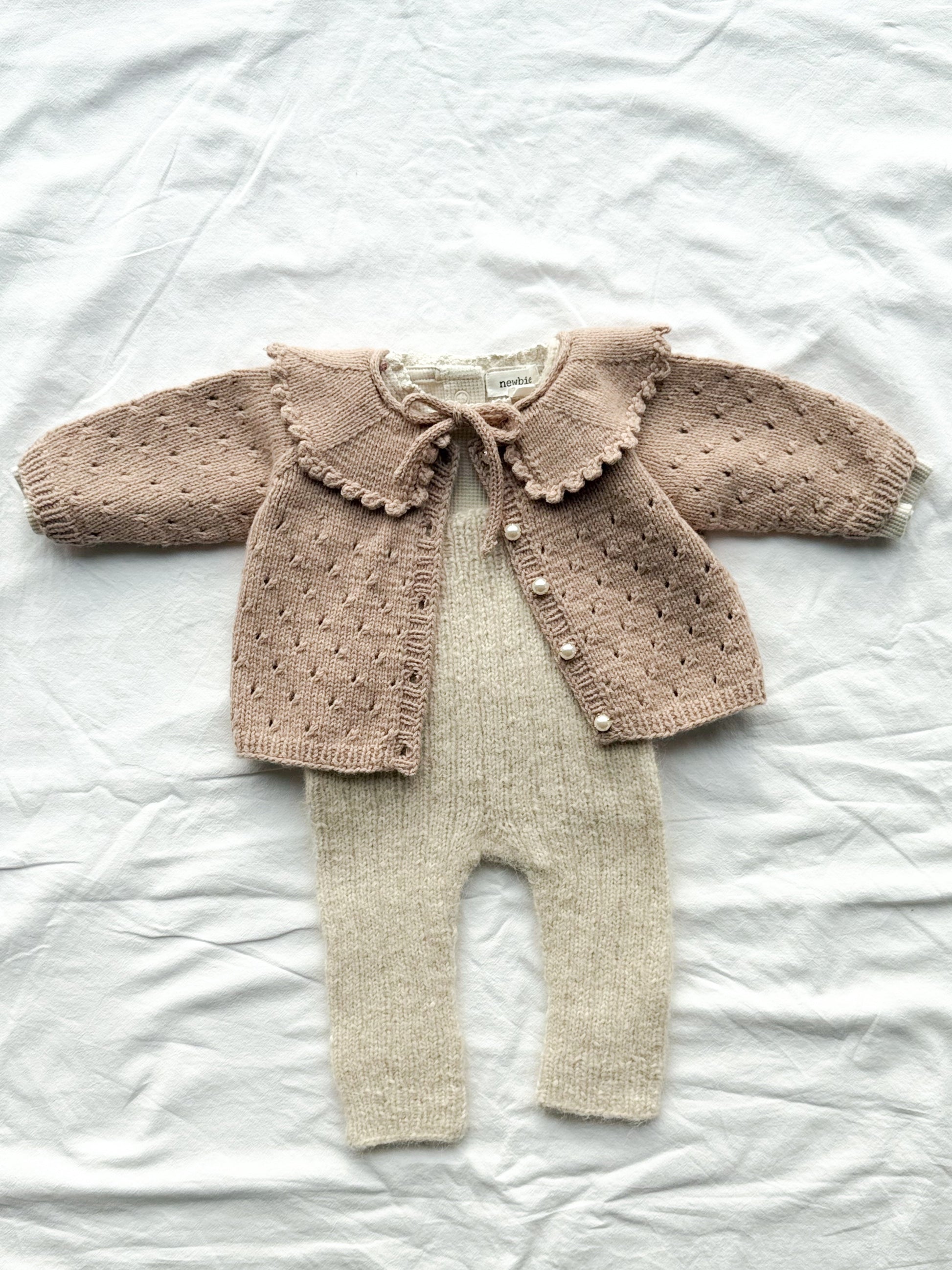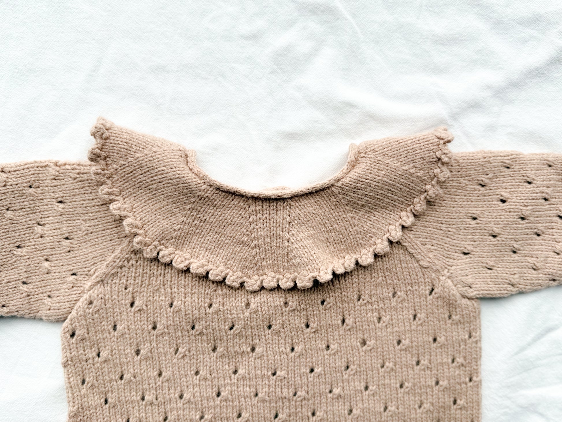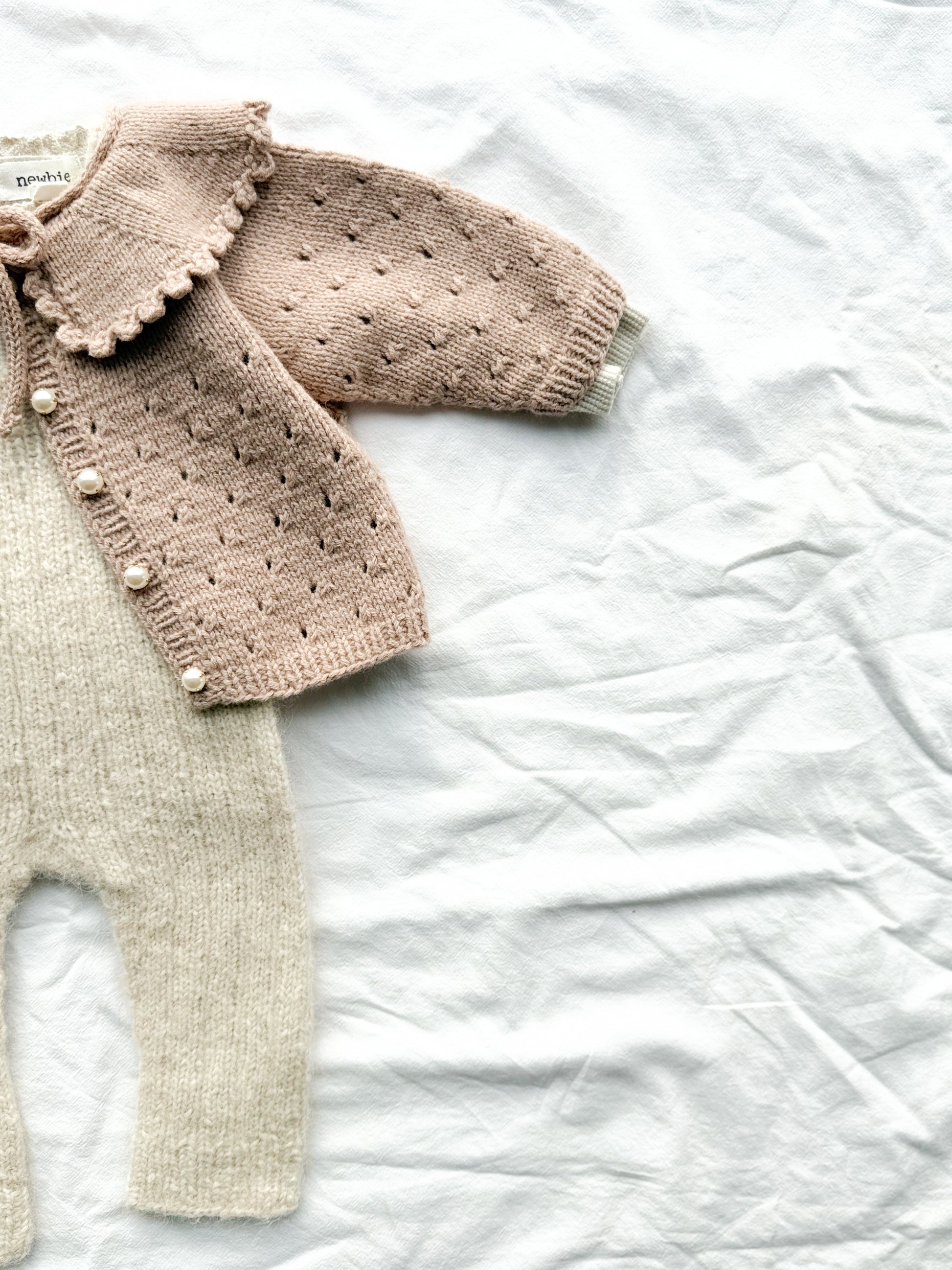 En klassisk, myk og tidløs babyjakke strikket nedenfra og opp, i myk merino. Jakken strikkes frem og tilbake på rundpinne med hullmønster på bol og ermer og raglanfelling på glattstrikket bol. En liten krage i halsen rammet inn med i-cordsnor.