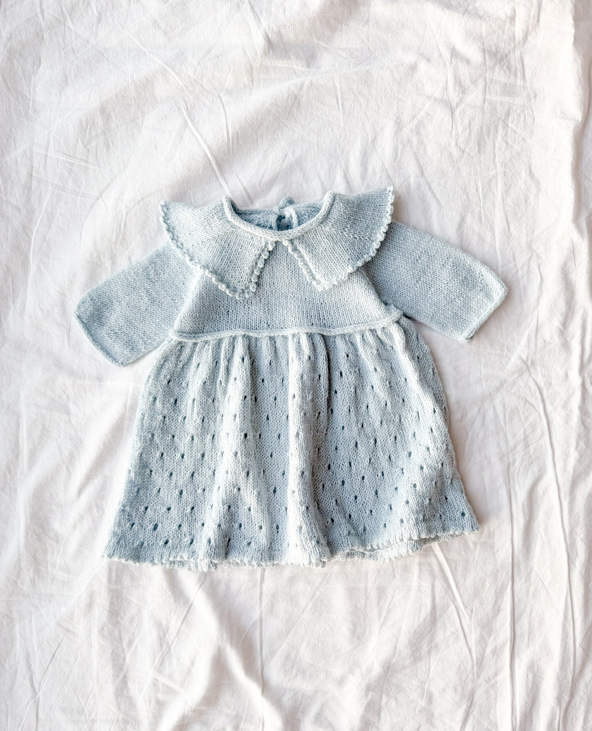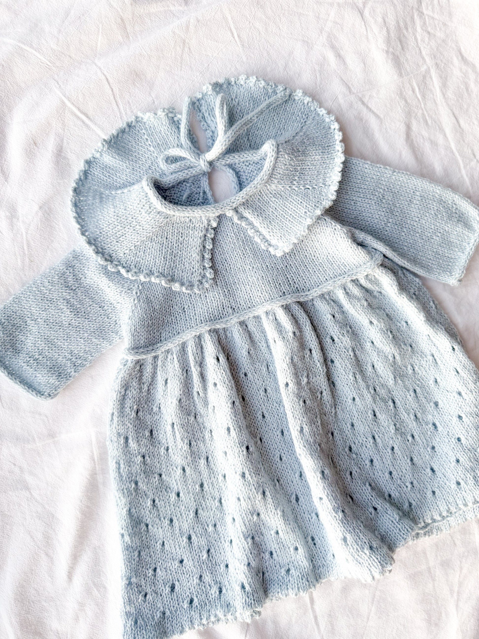 Strikkes ovenfra og ned, med fokus på rene linjer og gjennomtenkte detaljer. Overdelen og ermene strikkes i glattstrikk, noe som gir et tidløst og behagelig uttrykk. Skjørtet prydes av et enkelt og delikat hullmønster som tilfører kjolen liv og struktur uten å ta over helheten. I nakken strikkes en elegant splitt med en I-cord-snor som knytes bak, en liten detalj som gir kjolen et personlig preg i riktig Ellie stil. For best passform er det brukt vendestrikk i nakken. Halskant, ermekanter og livet avsluttes med I-cord, som gir en ren og myk finish.
