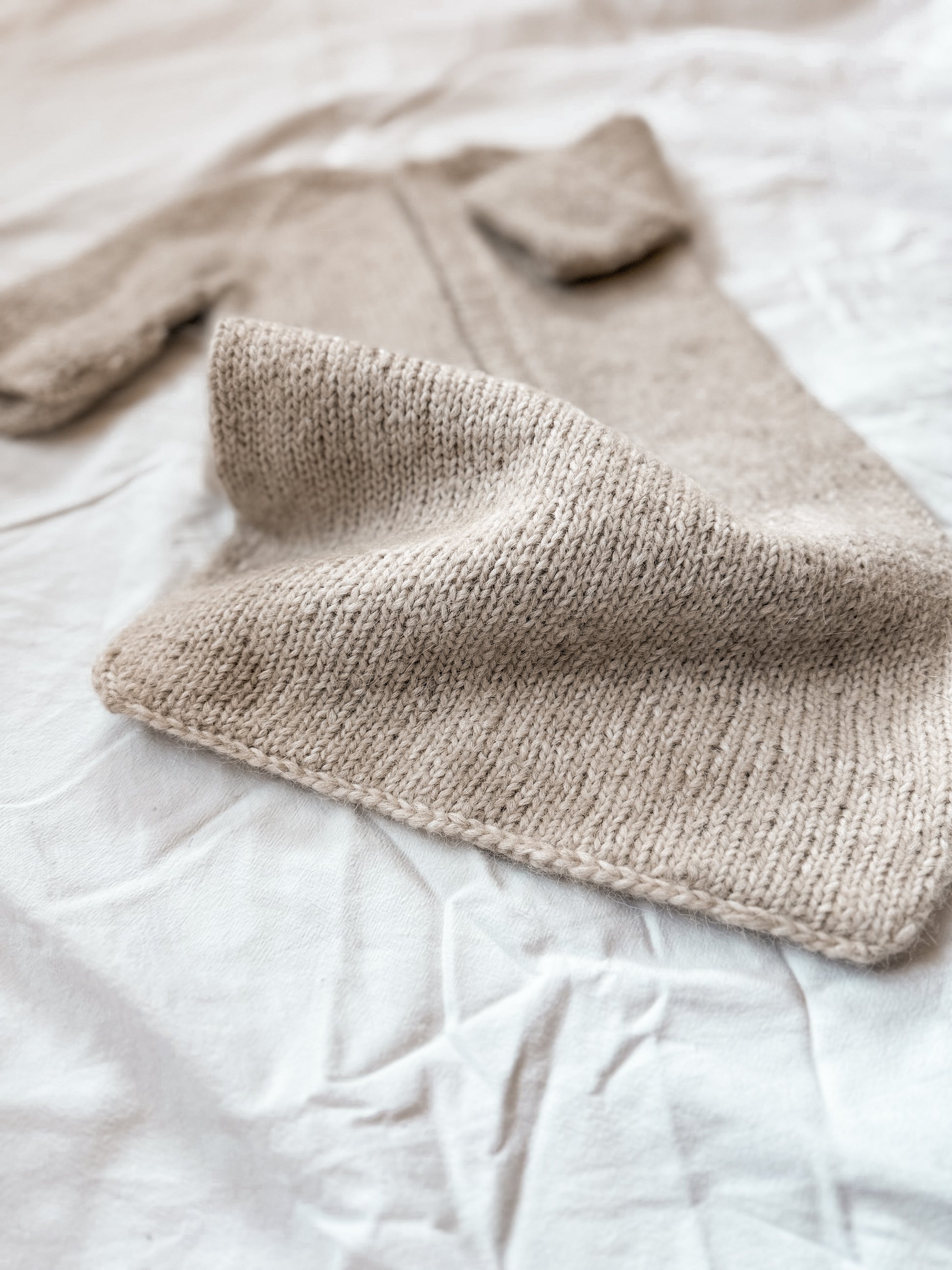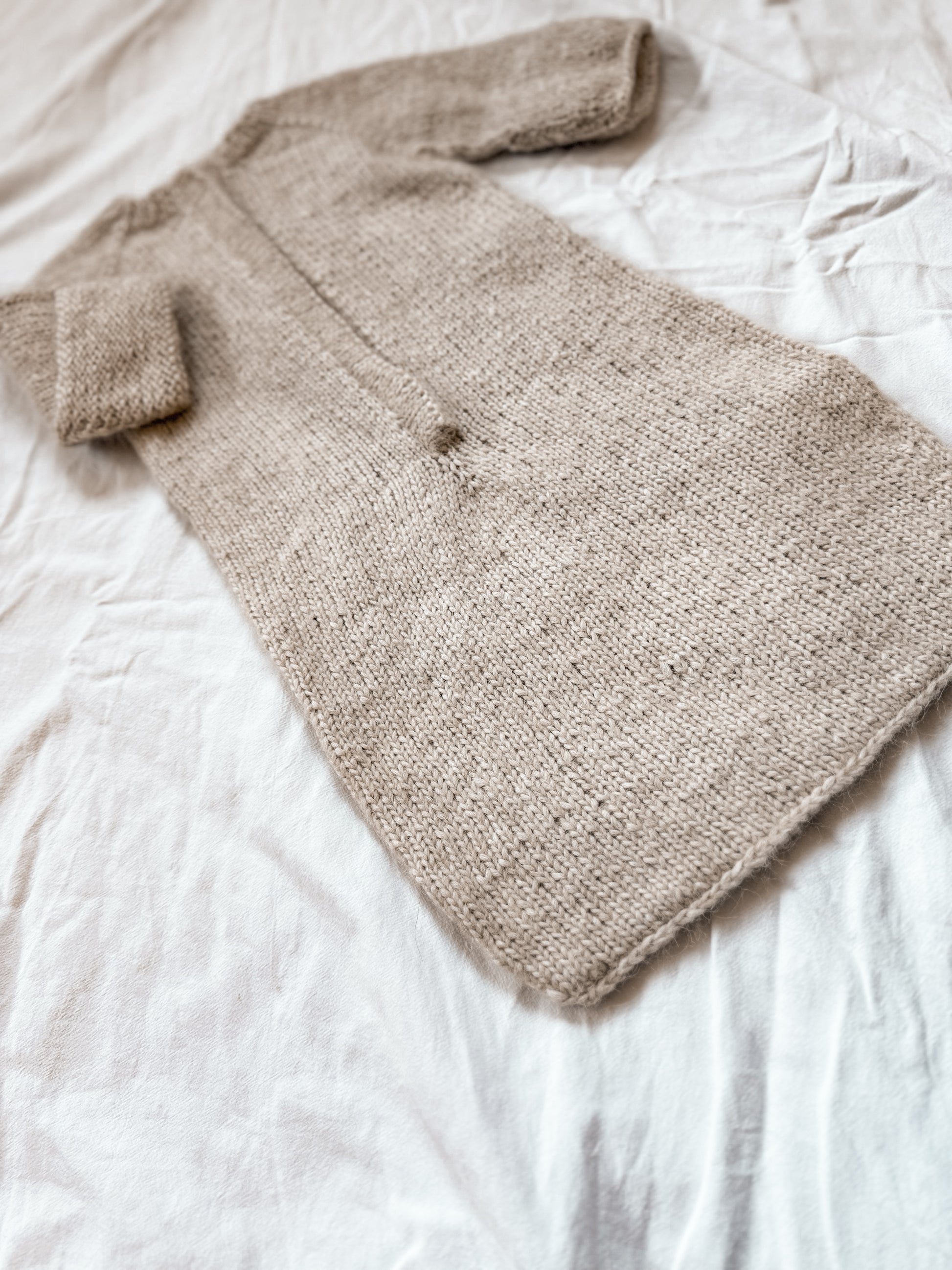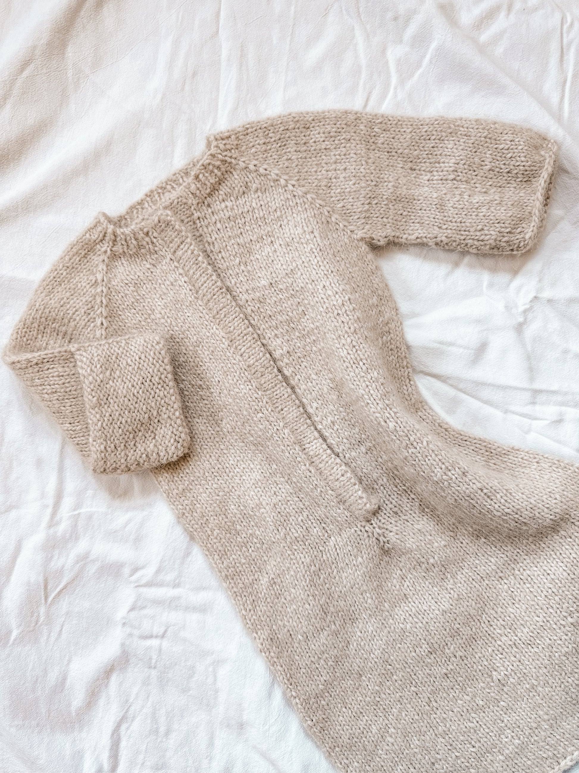 Denne myke og praktiske sovedressen strikkes ovenfra og ned med raglanøkninger. Modellen har omslag på ermene som kan brettes over for å varme små hender, og en innvendig knappestolpe som skjuler knappene for et rent og behagelig uttrykk. Sovedressen er designet med fokus på komfort, funksjonalitet og et tidløst uttrykk. Perfekt til soving i vogn.